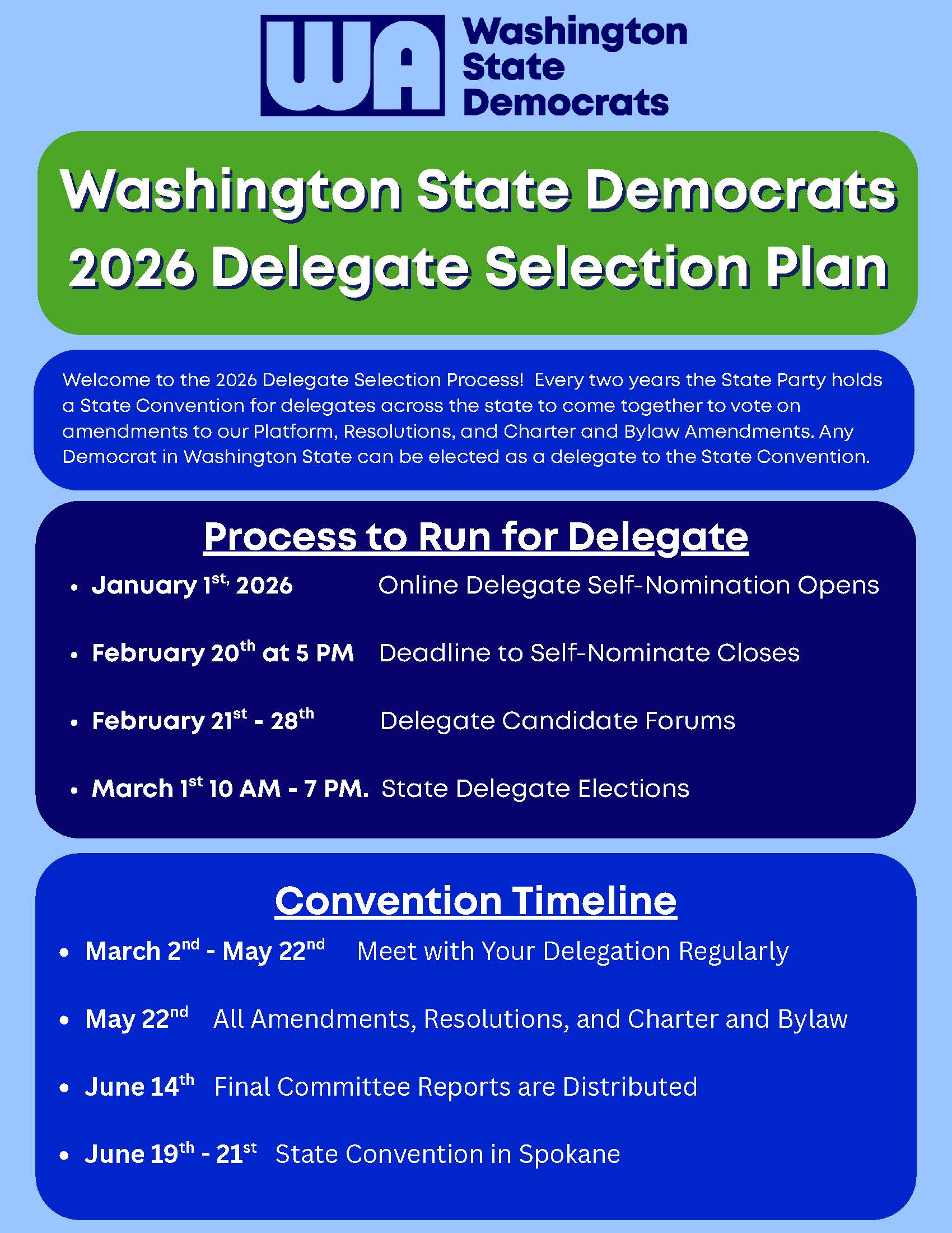 There’s still time to run for State Delegate and represent us at the 2026 Washington State Democratic Convention, June 19-21 in Spokane (attend in person or virtually!).
